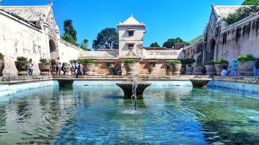 Beenden Sie die Becak-Fahrt am Taman Sari Wasserpalast. Diese Erweiterung des königlichen Komplexes wurde vor über 200 Jahren vom ersten Sultan mit Badebecken für seinen Harem erbaut.
